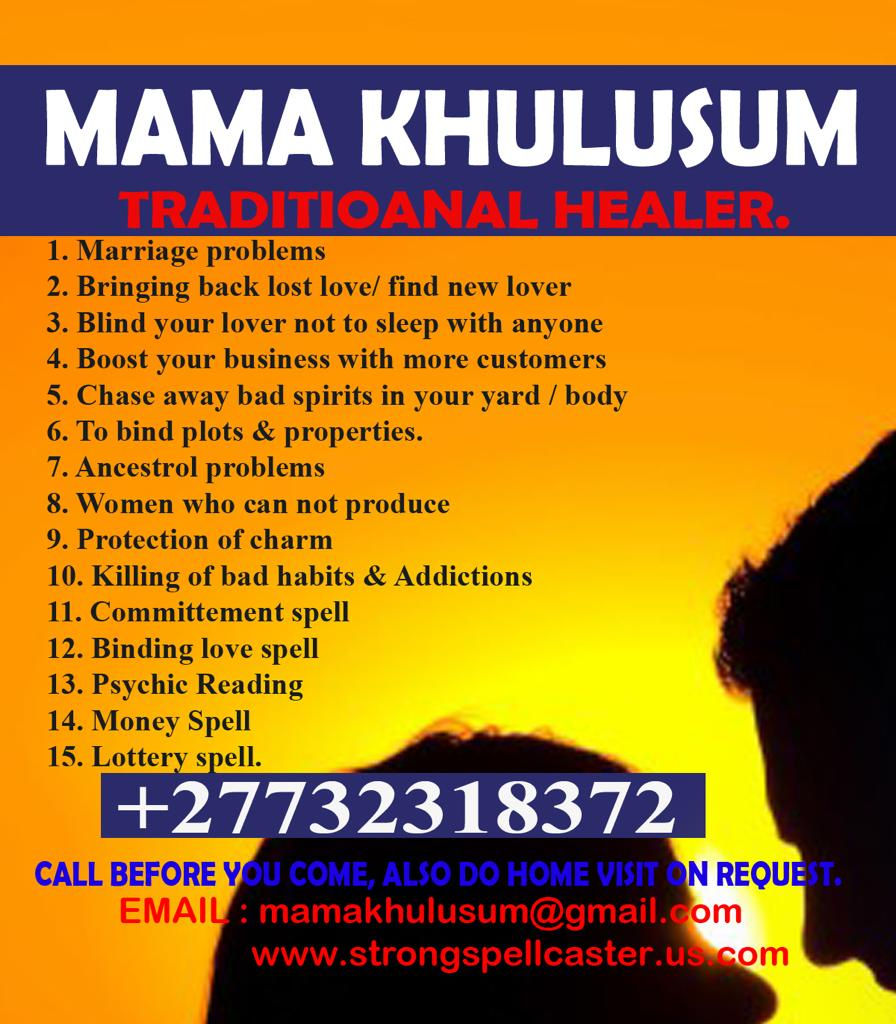 Prof Mama Khulusum gifted lost Lover Spells Caster to reunite you with your ex within a short period with too much love and respect than before. Many people still question whether love spells work or not, permanent or effective. This can be based on past experiences where they tried some spell casters but were not fully satisfied with their results or the love spells worked for just a short period and sometimes even never saw any results. To avoid such situations you have to be careful with spell casters you approach, some are limited with certain Spiritual powers to cast good love spells to help people in their relationships or marriages. Many good love spell casters are out there in the world (Africa, Asia and so on) Yes, love spells work, whether you are in a situation where you want to bring back your lost lover (lost lover spell), you want to get married to someone in a relationship (marriage spells), to increase love in your relationship (love affection spells) and much other related love spells, you will get help. It does not matter where you are or where your partner is, you don't have to be unhappy about a situation you can solve, it is all about finding a good love spell caster to change your love life. DR MAMA KHULUSUM is a celebrated love spell caster whose works have won her friendship all over the world from the people she met. To know more about spells and her wonderful works. For reading worldwide! NB ALL HEARTBROKEN PEOPLE IN ALL OVER SOUTH AFRICA AND THE WORLD, FEEL FREE TO CONSULT ME FOR